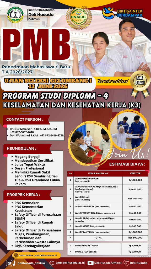 Penerimaan Mahasiswa Baru Program Studi Keselamatan dan kesehatan kerja (K3) Institut Kesehatan Deli Husada Deli Tua Tahun Akademik 2025/2026